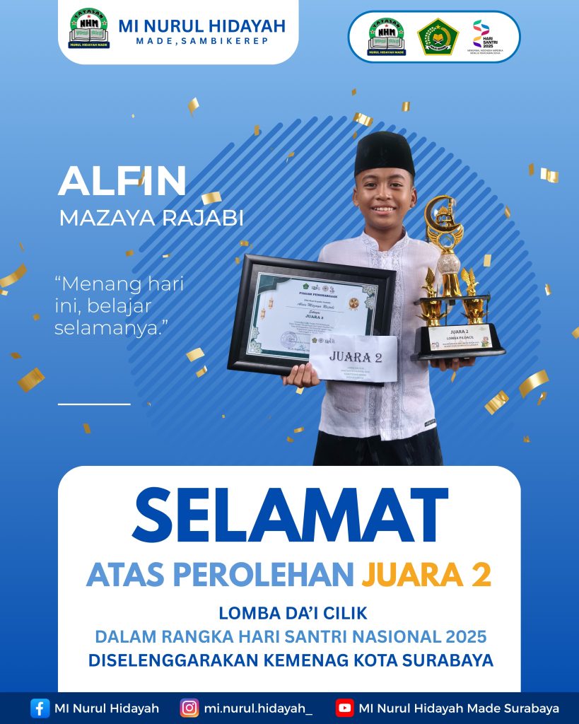 Surabaya – Dalam rangka memperingati Hari Santri, Kementerian Agama Kota Surabaya menyelenggarakan lomba Da’i Cilik yang diikuti oleh para siswa dari berbagai Madrasah Ibtidaiyah (MI) di Kota Surabaya. Pada ajang yang digelar pada tanggal 22 Oktober 2025, Alfin Mazaya Rajabi, siswa MI Nurul Hidayah, berhasil meraih juara 2 dalam lomba tersebut.